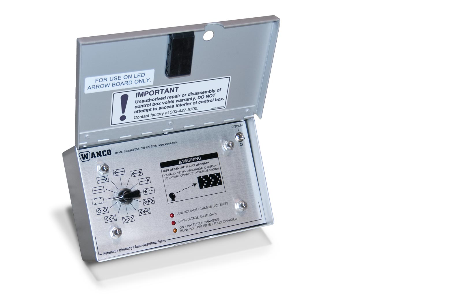 W|ECO Folding Frame Arrow Board Skids are full-size arrow boards on a frame that pivots the display panel up to the vertical position when deployed, and down to horizontal for transport. The display panel is held in place with a single support that ensures ease of use and prevents damage. All Wanco Skid-Mounted Arrow Boards are self-powered, requiring no wiring to an external power supply — and they feature the lowest power consumption in the industry without sacrificing performance. The control panel may be installed inside the truck cab or outside on the skid frame.